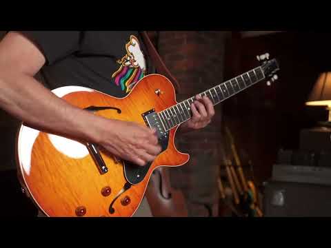 We love the Soco! This sleek single-cut, semi-hollow model has a 15” lower bout for a comfortable and balance feel. It features Lollar Low-Wind Imperial pickups and has a wide range of killer tones. It comes with a hard shell case.